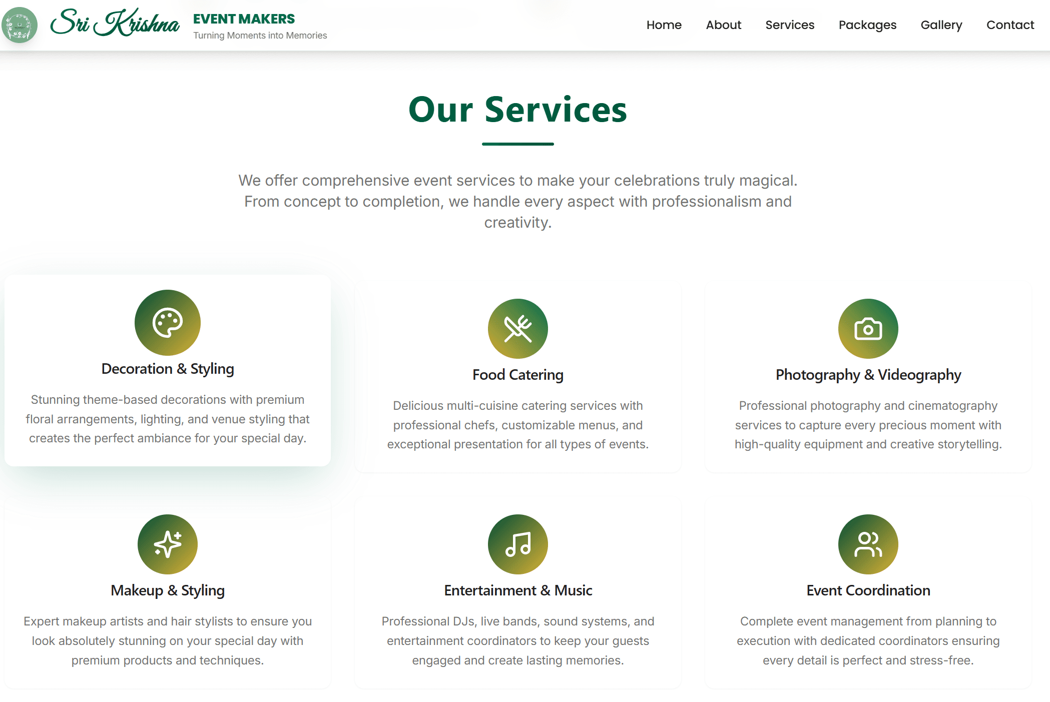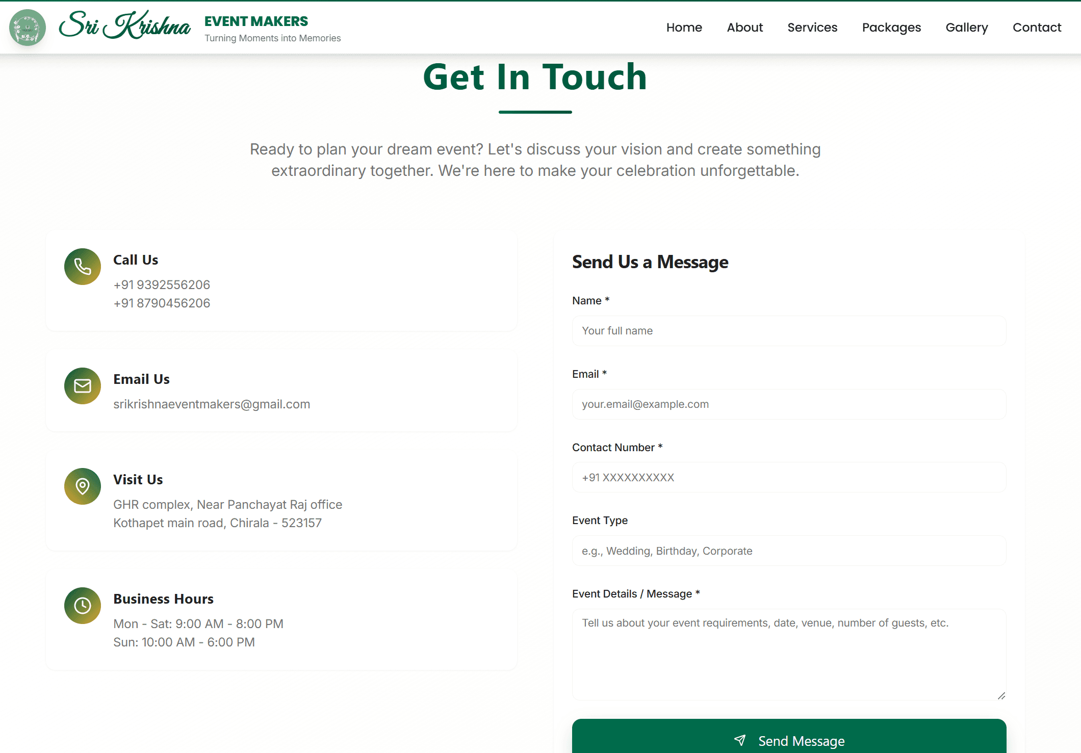 Sri Krishna Event Makers is a service-based event management business specializing in weddings, cultural events, and corporate functions. I designed and built the entire platform from the ground up, including a customer-facing website and an internal admin dashboard to manage inquiries.